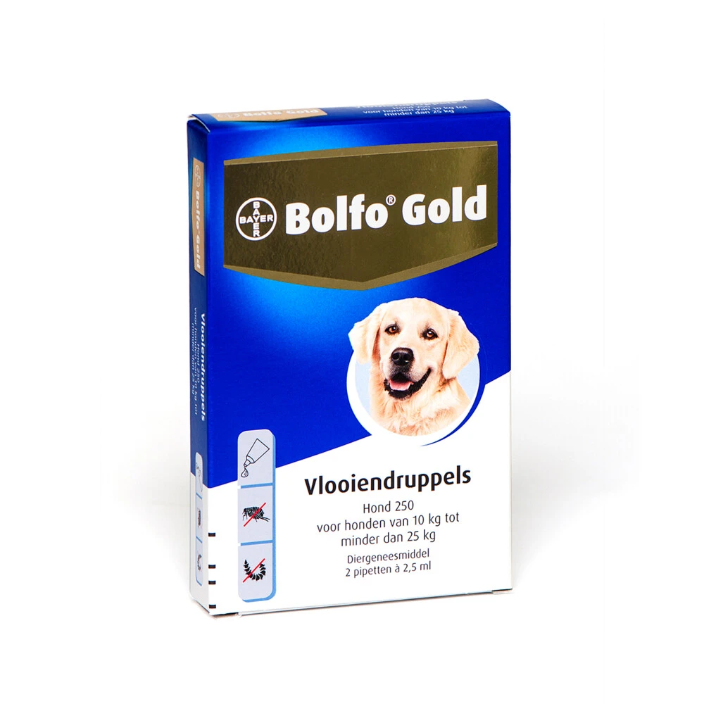 Bolfo Gold Anti Vlooiendruppels Hond 10 – 25 kgBolfo Gold heeft een snelle werking tegen vlooien en vlooienlarven. Veel vlooien worden al gedood voordat ze bijten en bloed zuigen. De toediening is gemakkelijk: je druppelt de inhoud van de pipet tussen de haren van jouw hond op de intacte huid.Snelle werking tegen vlooien (< 24 uur);Werkt tegen vlooien en vlooienlarven;Gemakkelijke toediening;Beschermt 4 weken tegen vlooien;Zeer geschikt voor honden met een vlooienallergie.
