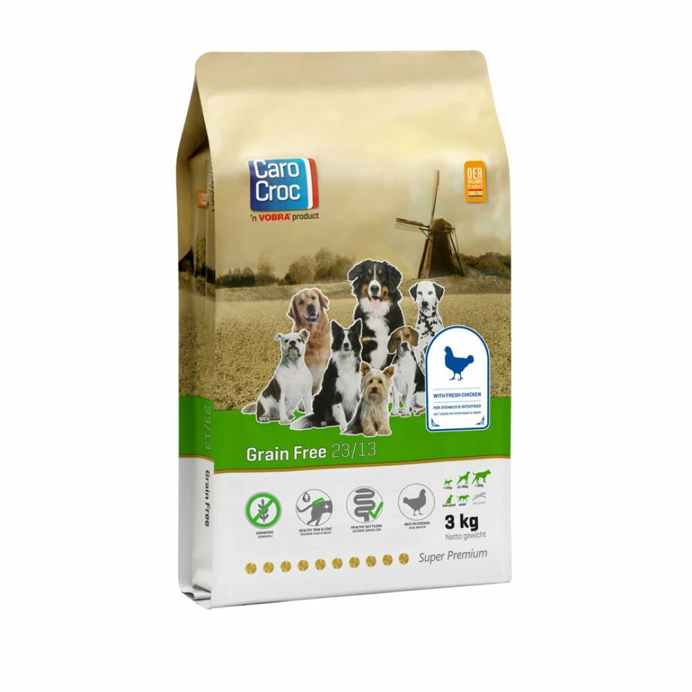 CaroCroc Hondenvoer Graanvrij 23/13 CaroCroc Graanvrij is een volledig hondenvoer voor volwassen honden van alle rassen en biedt een perfecte ondersteuning bij voedselallergieën. Ook draagt het bij aan het voorkomen van voedselovergevoeligheid. De toegevoegde zalmolie ondersteunt een gezonde huid en vacht en de extra bietenpulp draagt bij aan gezonde darmen.De hypoallergene brokken zijn bereid met verse kip en bovendien rijk aan gevogelte en aardappel. Daarnaast is er extra zalmoliie t