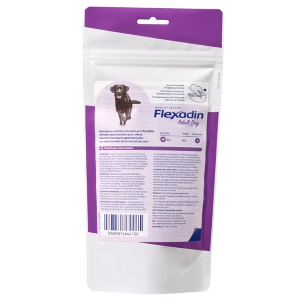 Vetoquinol Flexadin Adult Dog KauwbrokjesFlexadin Adult Dog werd ontwikkeld om aan de specifieke noden te voldoen van volwassen en senior honden, ouder dan 2 jaar. Flexadin Adult Dog bevat de unieke combinatie van UC-II®, Omega 3-vetzuren en Vitamine E ter ondersteuning van de gewrichten van je hond. De zorgvuldig uitgekozen hoogwaardige, natuurlijke ingrediënten ondersteunen de gewrichten en houden honden soepel. Bovendien is Flexadin Adult Dog makkelijk te geven. Door de unieke s