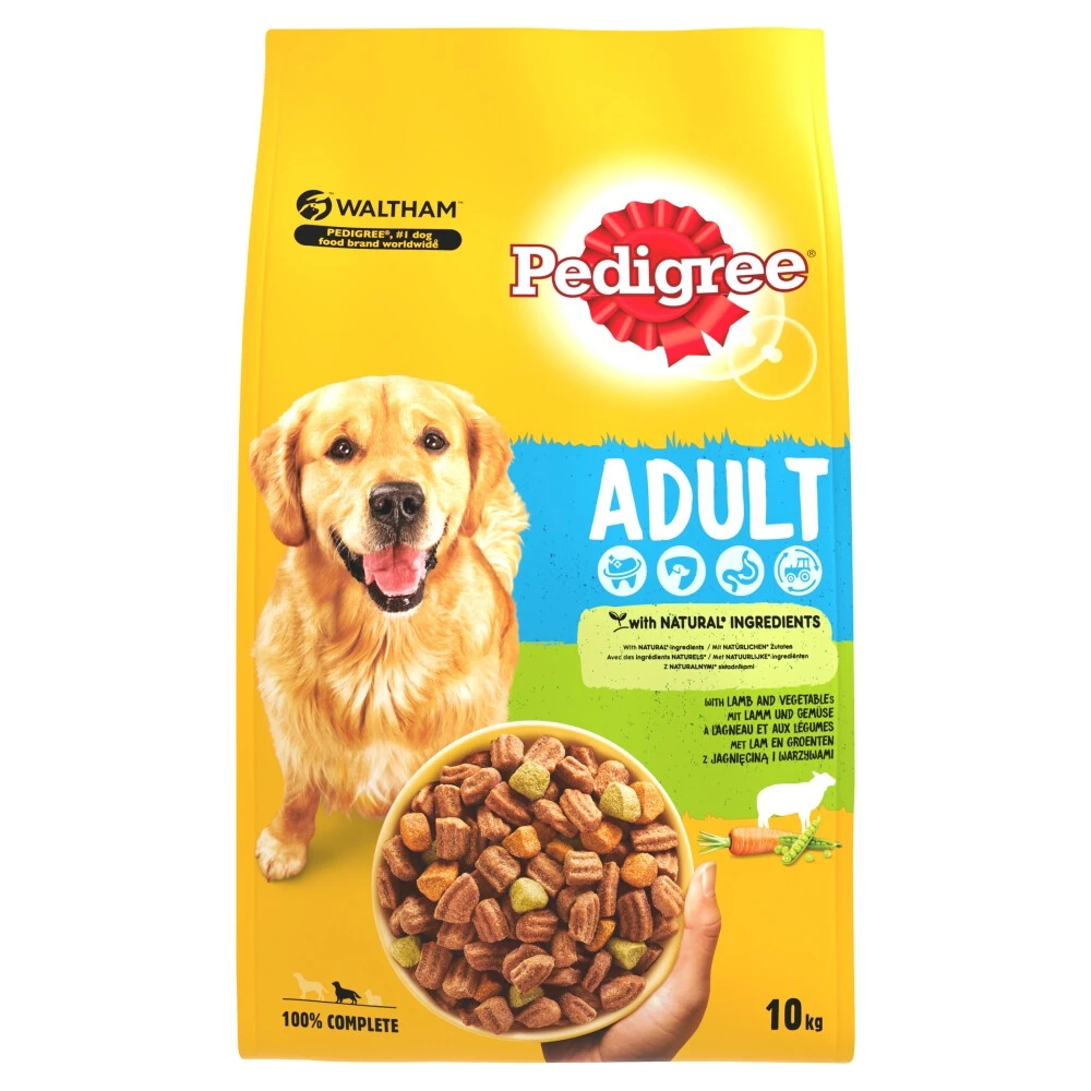Pedigree Droog Adult Lam 10 kgPedigree Droog Adult Lam bestaat uit twee soorten met vlees gevulde brokjes die heerlijk mals & knapperig zijn. De brokjes zijn overgoten met een smakelijke vleesjus en die zorgt voor een gevarieerde textuur en een heerlijke smaak. De knapperige brokjes met een zachte vleesvulling leveren natuurlijke vezels voor een goede darmfunctie. Speciaal geselecteerde groenten voor mineralen en vitaminen. Speciaal gevormde knapperige brokjes, voor gezonde tanden en tandvle