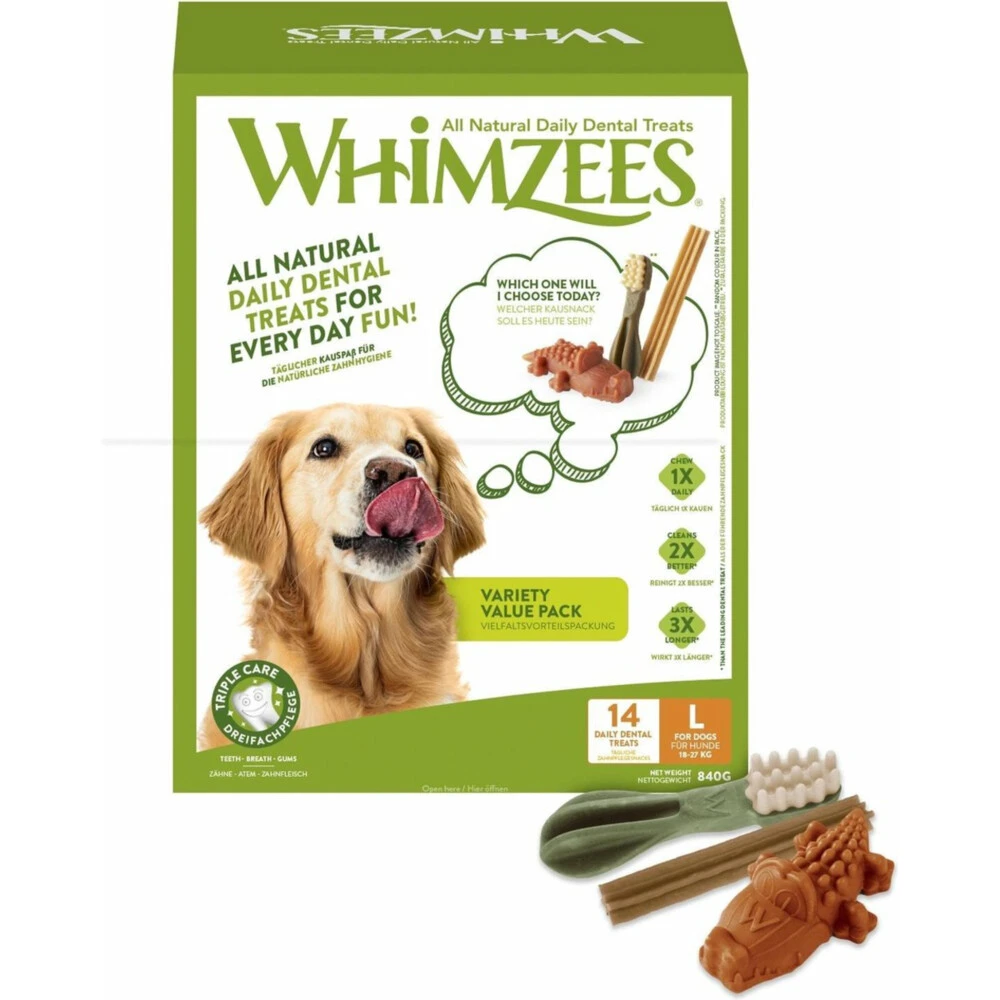 Whimzees Variety Voordeelverpakking LargeDeze voordeelverpakking bevat 14 heerlijke kauwsnacks voor jouw hond. Met deze snacks zorg je er voor dat jouw viervoeter een schoon gebit houdt en tandplak, tandsteen en ontsteking worden voorkomen. De kauwsnacks zijn gemaakt van 100% natuurlijke ingrediënten en daarom ook nog eens een heerlijk verantwoorde snack.Licht verteerbaar100% natuurlijkDraagt bij aan een goede gebitshygiëne Geschikt voor honden van 18 tot 27 kg